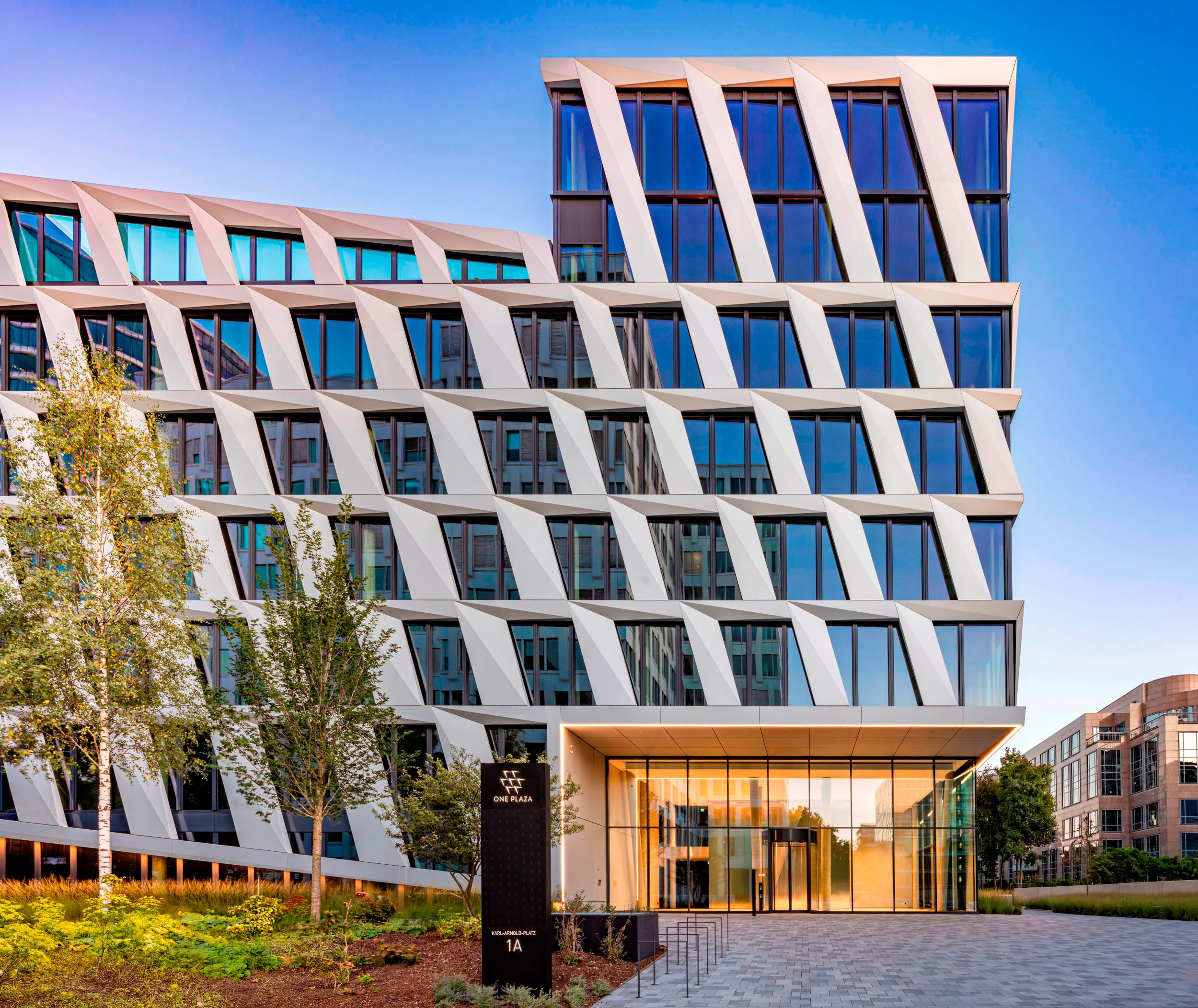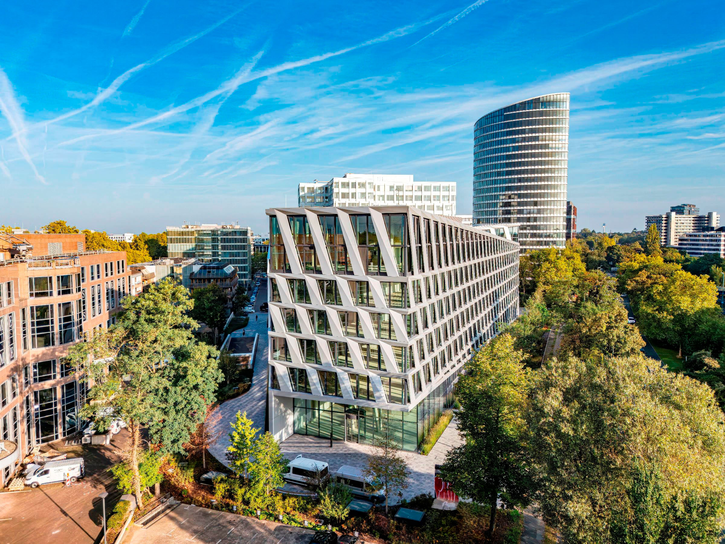 全新One Plaza办公大楼以简洁的设计语言和鲜明的设计元素,为杜塞尔多夫城市天际线再添一座标志性建筑。该项目毗邻HPP设计的L'Oréal欧莱雅德国总部和Eclipse普华永道办公大楼等项目,共同塑造着肯尼迪堤大道这一城市重点发展区域的城市面貌。多年来,HPP一直很荣幸参与着这一区域的演进过程。