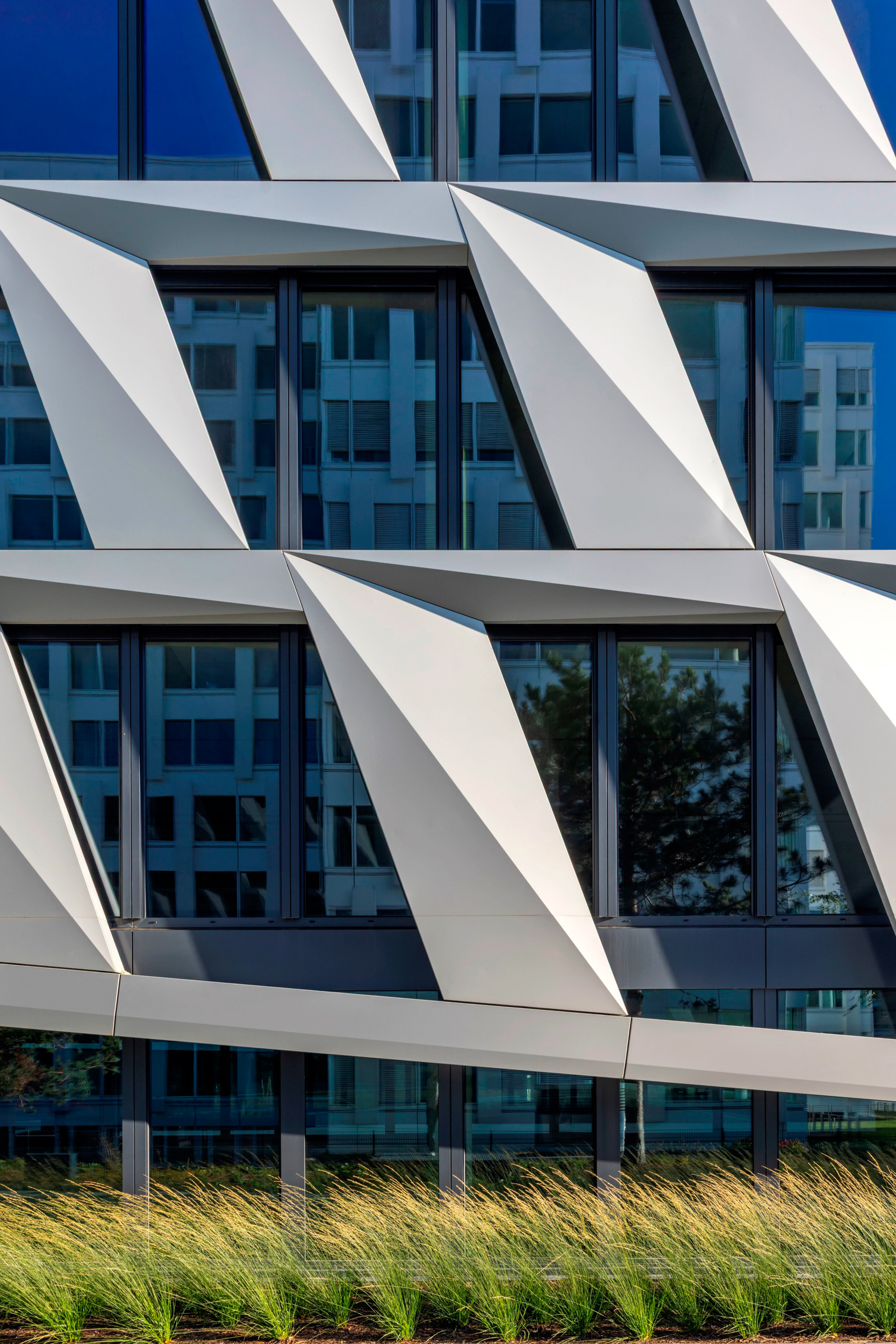 大楼在三个端点处均设计了宽敞的入口,为使用者提供极大便利,并尽可能的将首层与周边空间紧密连接,以激活社区。设计师将立面元素从屋顶标高处向上自然延伸,与屋顶花园的景观相得益彰,并在功能上有效的避免了人们在屋顶花园活动时受到风的影响。