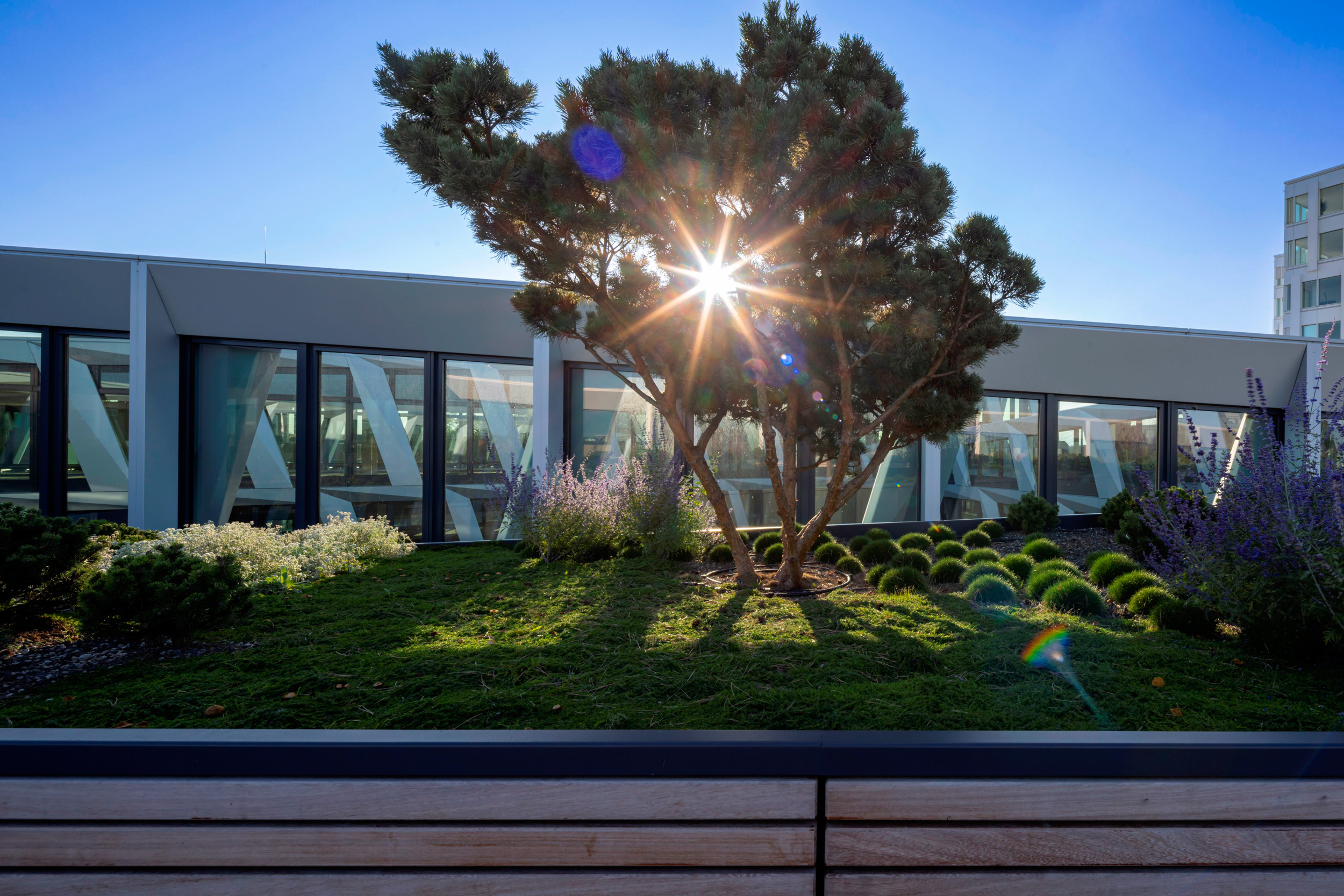 设计师在建筑内庭园打造出一方绿色谧境:三棵树龄逾三十载、高达二十五米的苏格兰松构成“森林家园”概念的核心景观,成为都市空间中惬意氛围的象征。同时设计上规划出宽敞的户外空间与绿色屋顶平台,既提升了城市生态韧性及生物多样性,也为人们提供了休闲社交的场所。