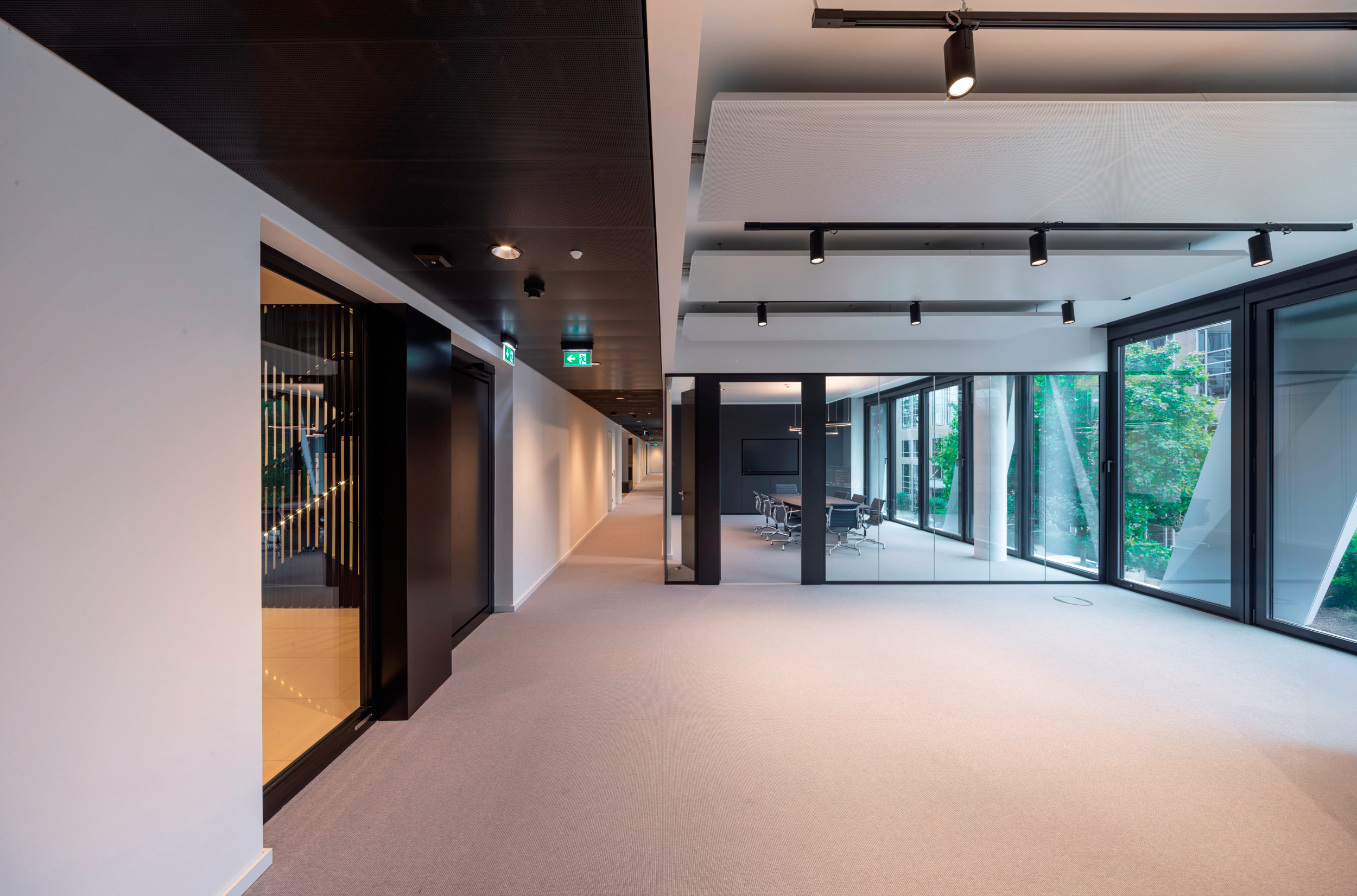 建筑内办公区域的设计为使用者提供了高度灵活性,租户可根据自身需求对室内空间进行自由组合。固定工位设于靠近立面的外围区域,中心区域则设计为灵活可用的工作空间,为员工提供多种工作模式选择。而核心处的封闭庭院作为建筑的中央绿肺,可用作内部聚会场所,与周边的开放空间形成联系。
