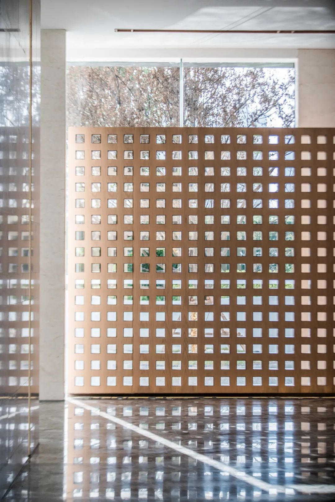 太阳强烈,水波温柔,穿过一片水景进入接待区。光洁的建筑立面与舞蹈式的光影,倒映在羊驼脚下的地面,折射成一片浪漫之色,真实生灵物像与稍纵即逝的光影相互交织,情绪在不同的维度间跳跃。