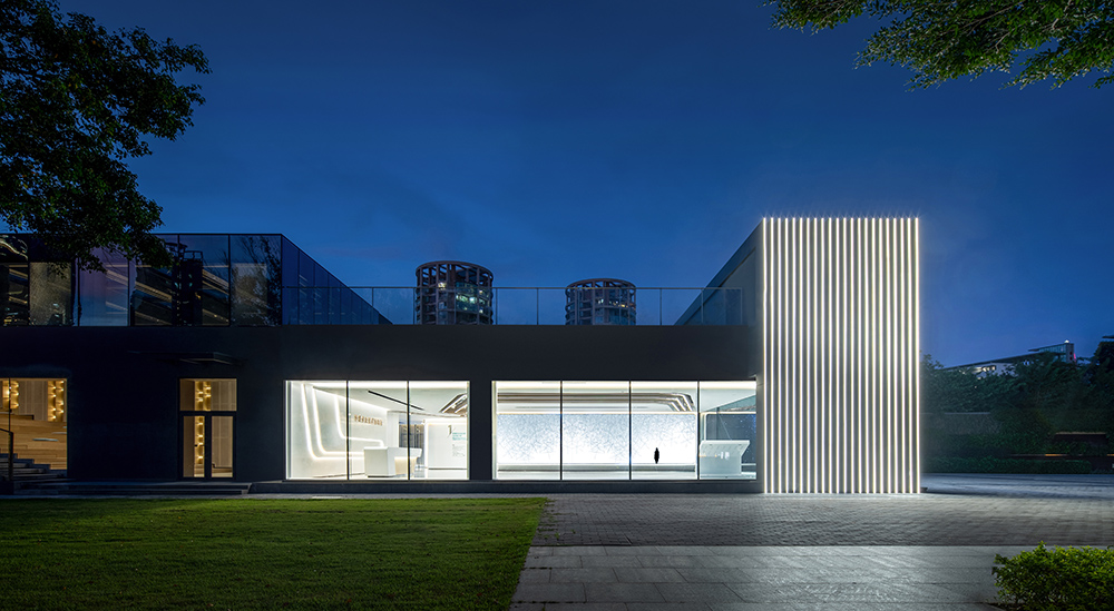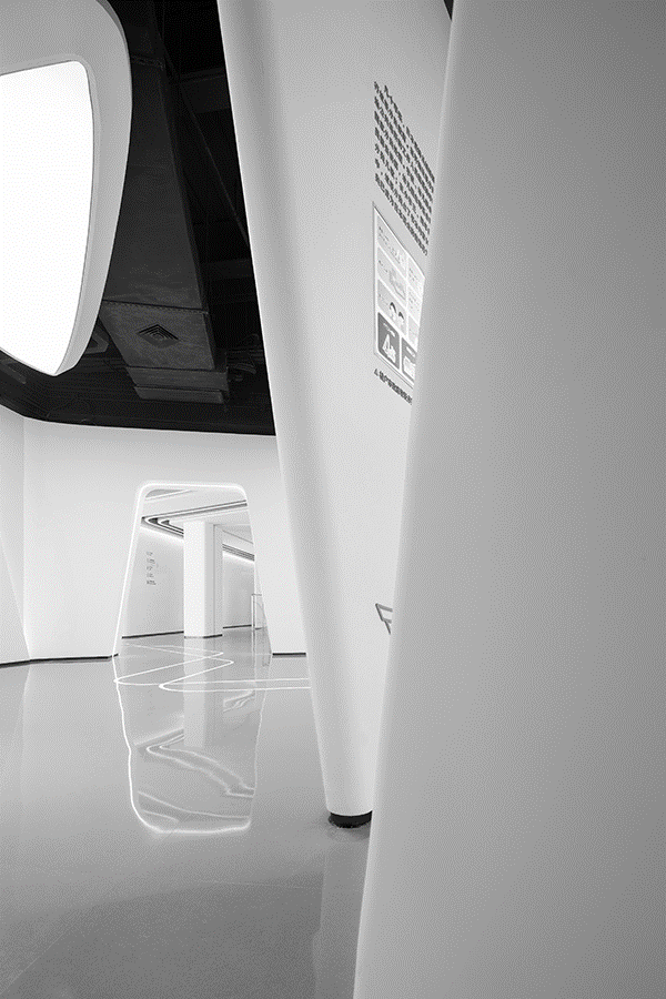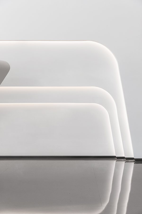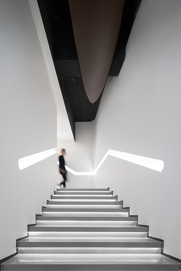 流线形灯光漫延分布于整个空间,光与线条的微妙联动,既指引空间的游走动线,也象征着一种速度与时代精神,光的感知与自由流动赋予建筑和空间旺盛的生命力。