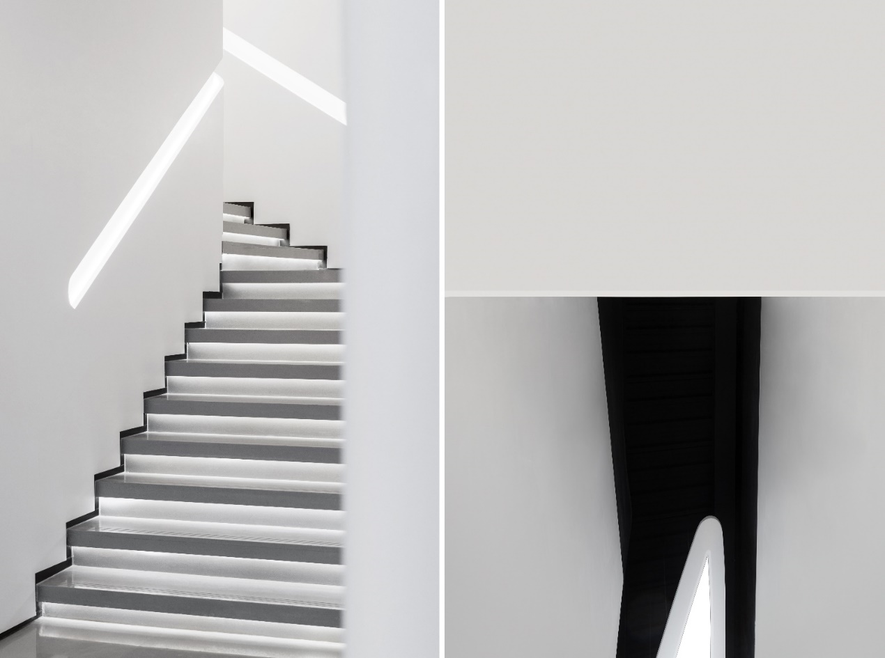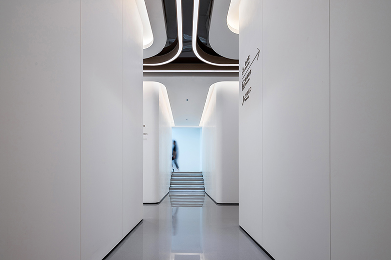 剥离建筑结构与所有装饰形态,空间为最终的载体,将流线与序列打散重塑空间,曲线、圆弧、倾角粘结构建戏剧性的空间体验。
