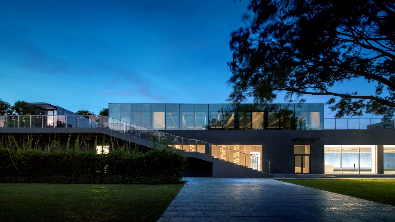 设计师将原有建筑拆解、重构,将若干个盒子连接构成建筑主体,完成了部分区域由室外转化为室内空间的过程,盒子的相互连接最终将原建筑散落的碎片式空间融合为统一、整体的展示性室内空间。重构后的建筑主体宛若发光的盒子,在暮色中微微发光。