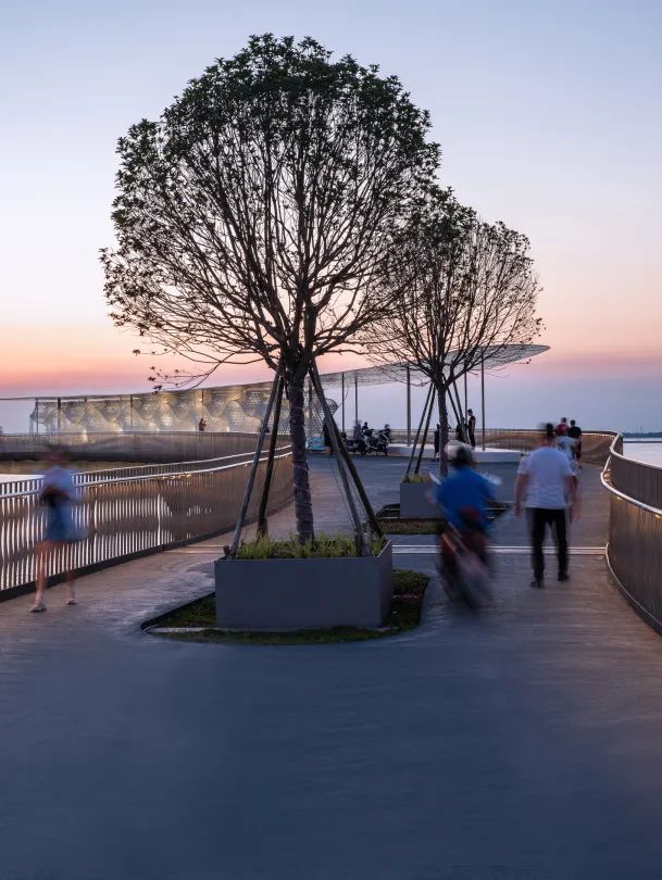 在行进的方向上,步行者和骑行者进入不同的线路,绿化带将两者间隔开来,这种线性设置为当地居民的健康生活划分安全边界。曲桥有三个加宽的部分,各条线路相合,并加入休闲长凳、观景平台、景观亭等,可供游人休憩及观赏湖景。这种线路设计延续了江南文化的动观为游,妙在步移景异,奇在风景如画。游赏相间,动静交替则元荡湖之景致尽入眼中。