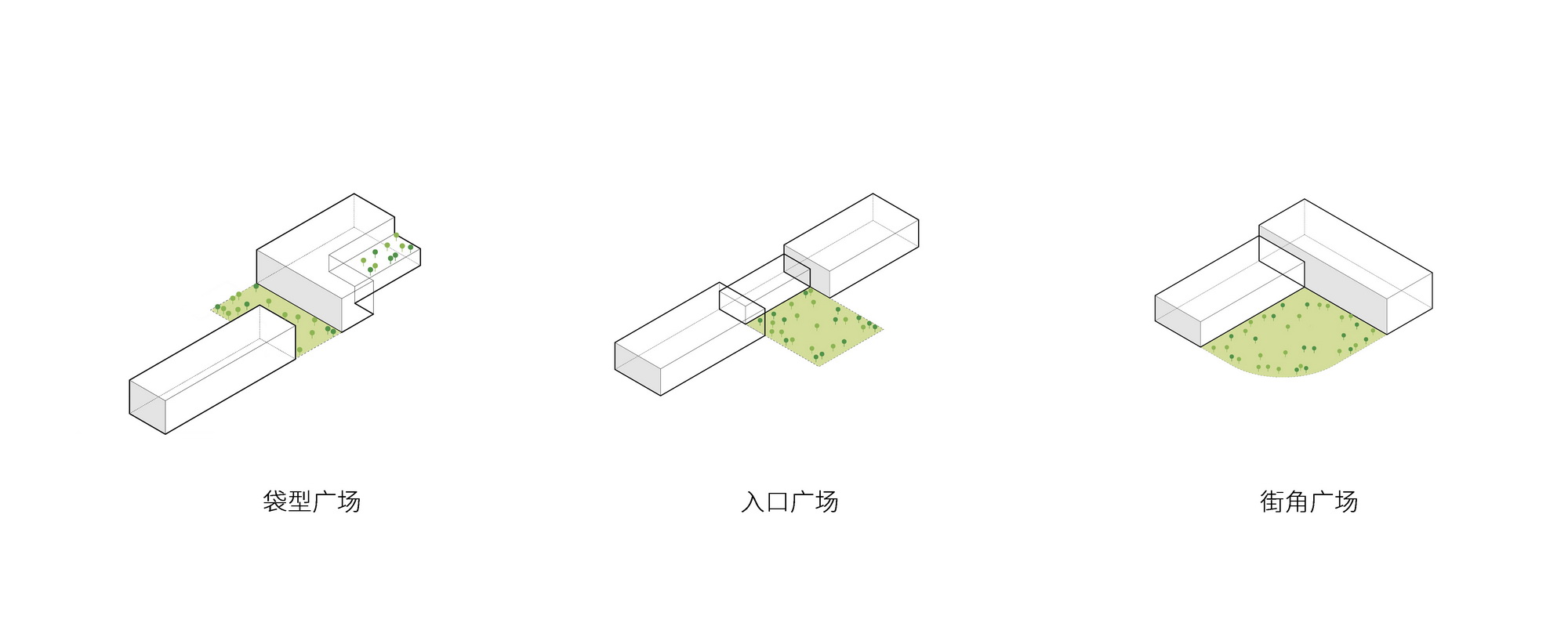 短短的商业街中镶嵌多样的小型广场,包括袋形广场、入口广场、街角广场。它们丰富了步行街的趣味性,也保证了商铺的展示界面。商业街二层的大露台将地面人流上引,为人们提供观湖小坐的绝佳位置。