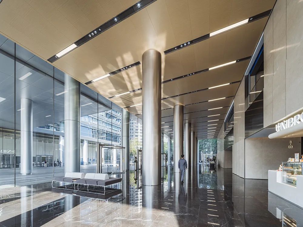 高10米的办公入口大堂采用入槽式无立柱幕墙系统,超白玻璃幕墙最大限度削弱了室内外间隔,提升空间的视觉连接。立体的银白色外立面既可以遮阳节能,同时也能将日光反射到办公天花中。部分楼层全景窗延伸成为阳台,提升办公空间品质。