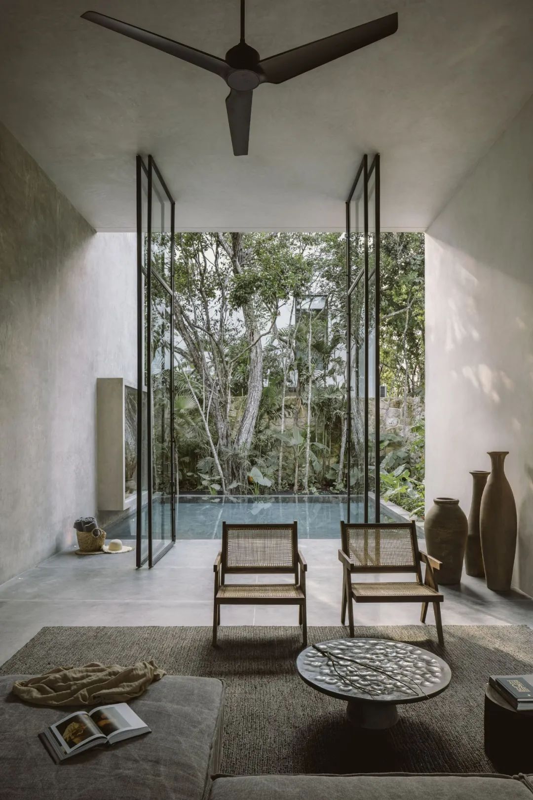Aviv house距离图卢姆海滩和水晶洞井不远,这座330平方米的住宅建筑旨在提供隐秘和宁静的氛围,独立地坐落在丛林中,将建筑与外部自然景观合并成一个宽敞、宁静的场域。