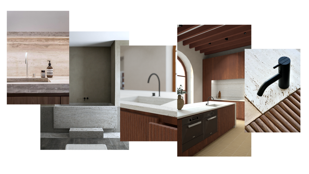 这种方法最好的例证是底层厨房的设计,这个区域是住宅建筑中心的一个公共空间。由实心胡桃木板条和浅奶油色石灰华表面制成的定制橱柜是精致设计的缩影,而陶瓷地砖、木屋顶梁、原始石壁炉和相邻的石水槽则说明了这座建筑的朴素起源,内置蜿蜒的长椅勾勒出一个连接现代与传统的早餐区。