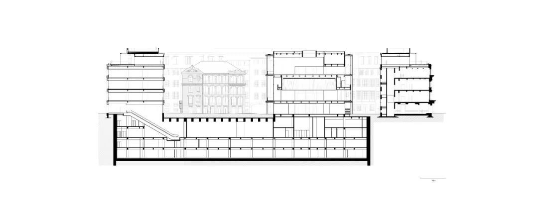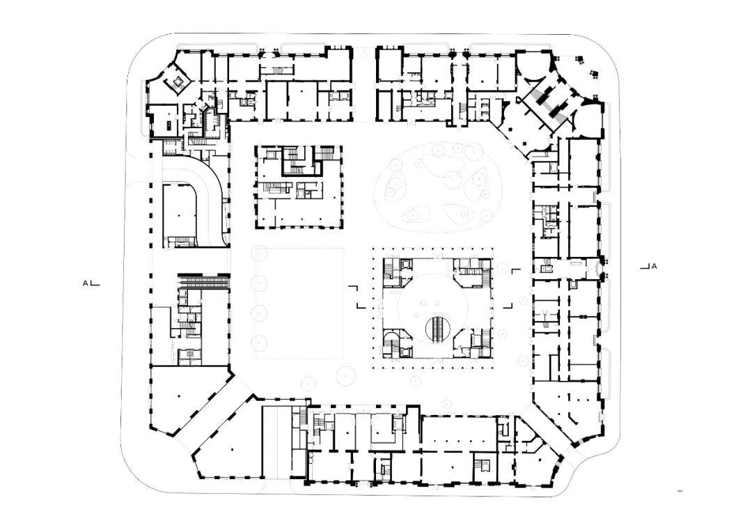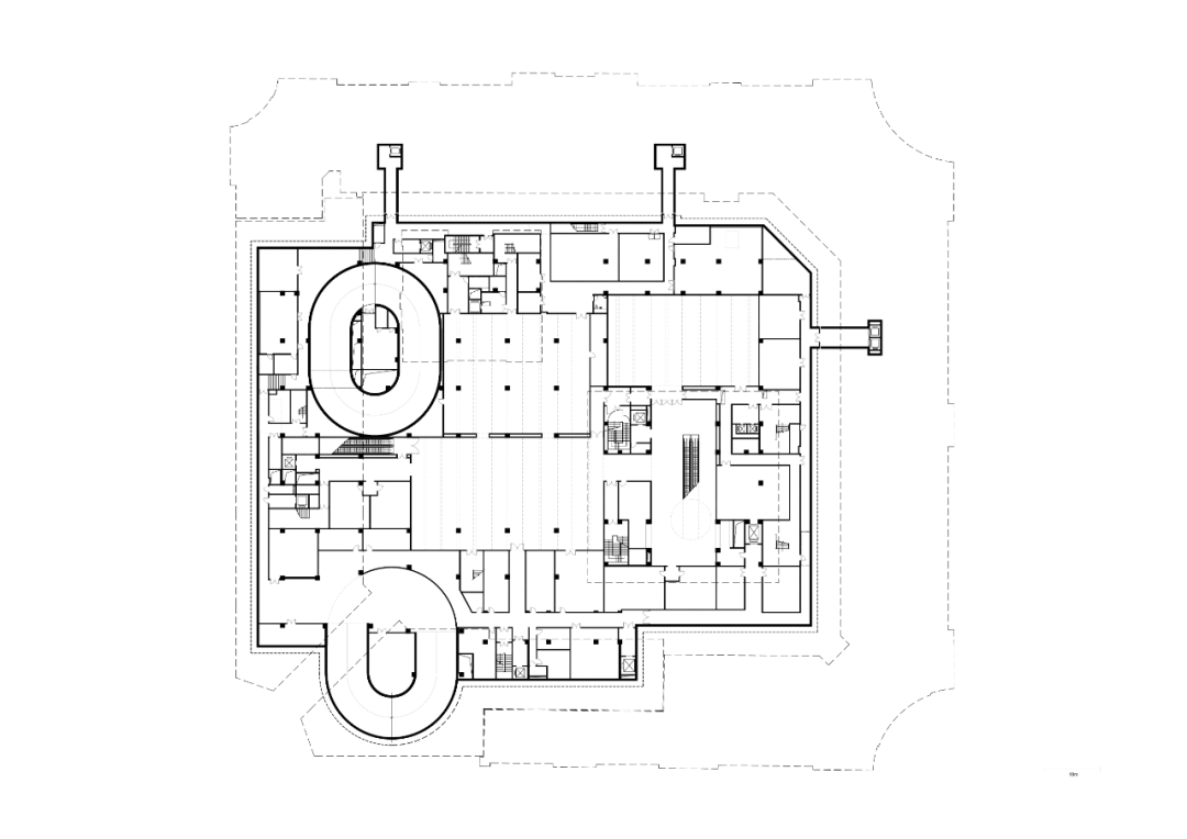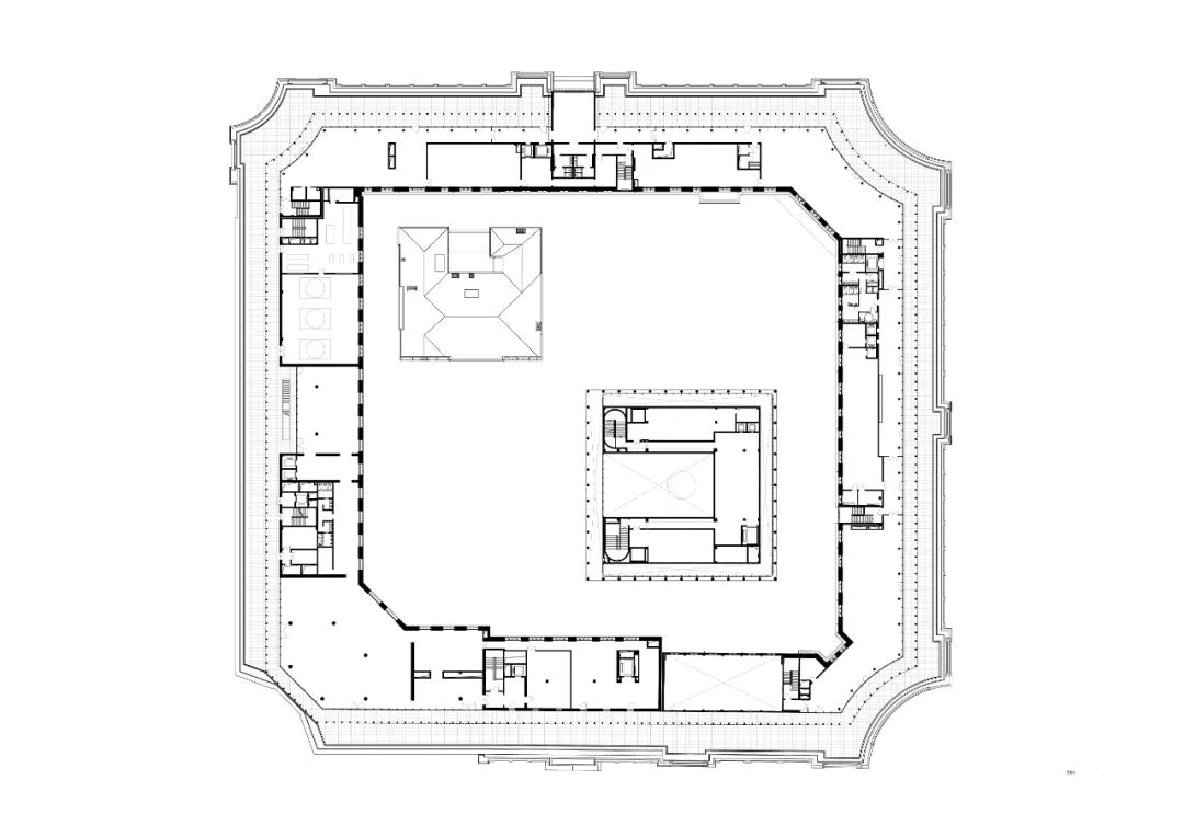 fifth floor plan在庭院内,两座建筑将定义一系列不同尺度和特征的空间。红楼是一座建于20世纪初的维多利亚风格的红砖别墅,比工部局大楼的历史更加悠久。它将被修复、改造,以容纳餐厅和其他公共功能。另一座用于活动和表演的新建筑将取代原礼堂。该庭院建筑的中心对称的平面提供了面向各个方向的开放性,与室外庭院互动,反映了其公共建筑的属性。位于地下室的文化和商业空间可以从庭院建筑进入,与该综合体中的所有公共功能一样,肯定了庭院在该项目中的关键作用。