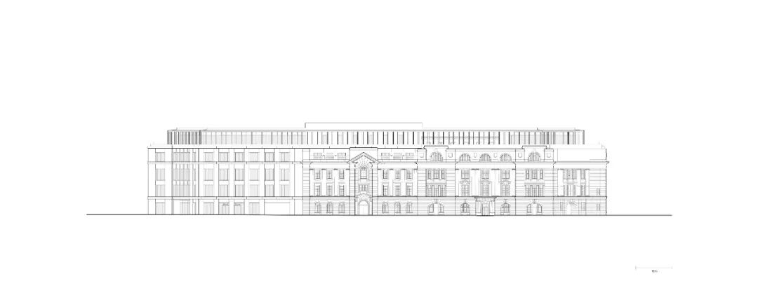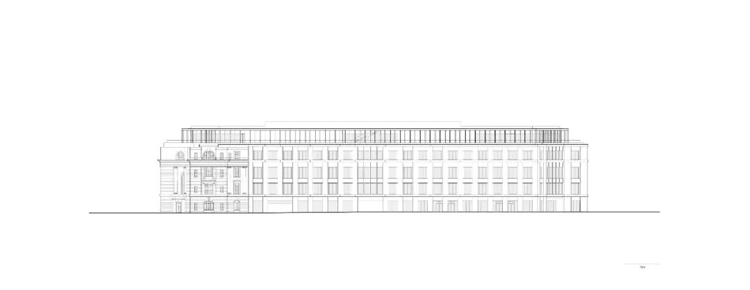The SMC building, which was listed as Cultural Heritage Building in 1989, will be restored and adapted for office use while key historic interiors will be opened to the public for the first time. A new office building will complete the urban block according to the original design, defining a courtyard space that is open to the public. A permeable and public ground floor will activate the courtyard and improve accessibility across the site. The façade of the new building is a contemporary interpretation of that of the historic building, utilising a stripped-back version of its neoclassical language. A set-back pavilion structure runs along the top of the building. It will host bars and restaurants opening on to a large terrace that offers views of the city along the entire perimeter of the site.