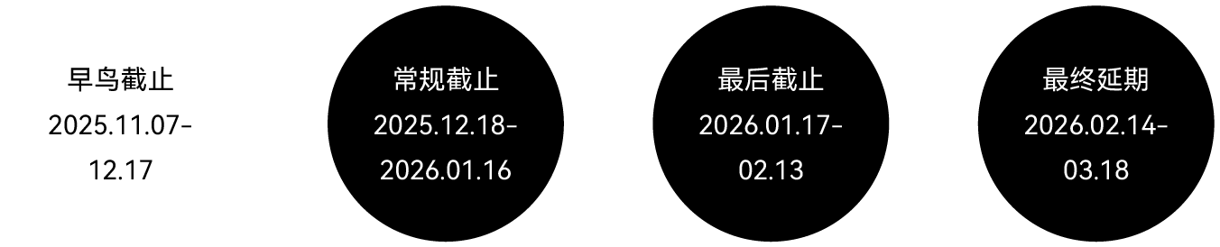 a. 早鸟截止 | 1888元人民币/套+ 980元报奖费/套,1 套共2868元人民币b. 常规截止 | 1988元人民币/套+ 980元报奖费/套,1 套共2968元人民币c. 最后截止 | 2188元人民币/套+ 980元报奖费/套,1 套共3168元人民币