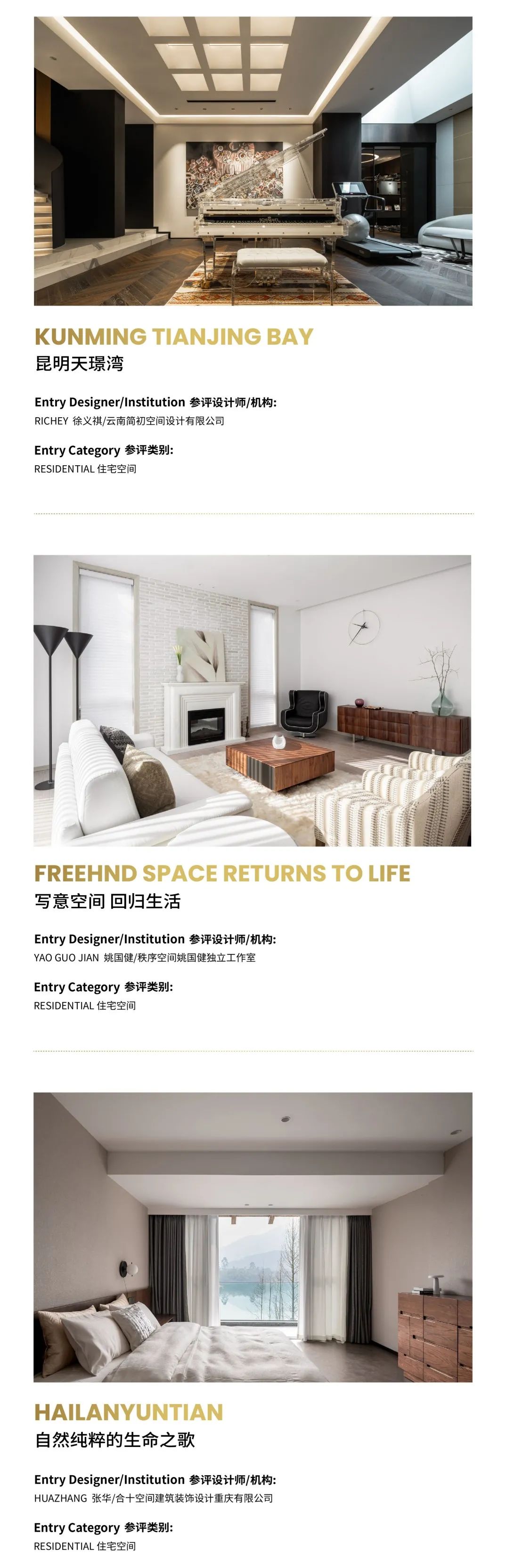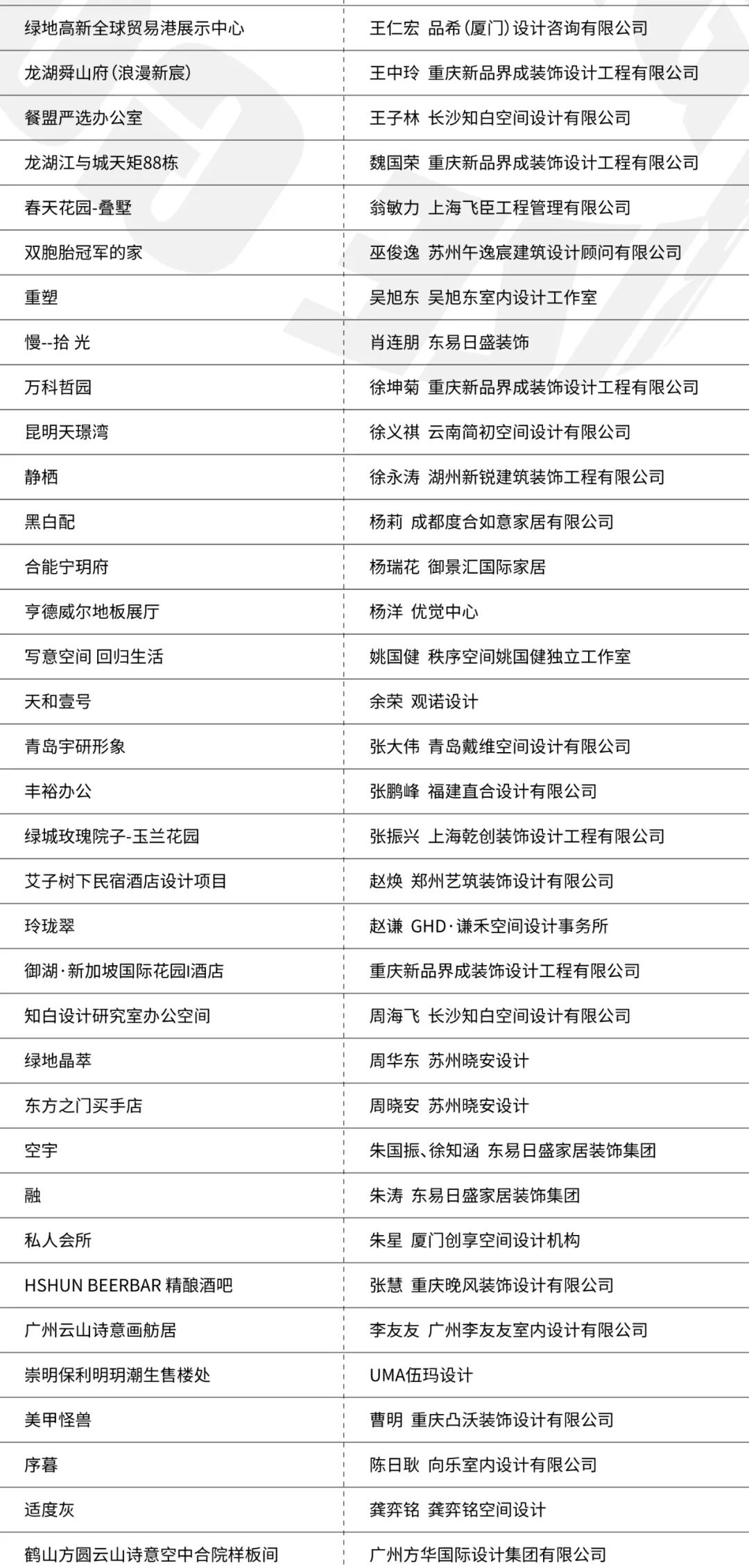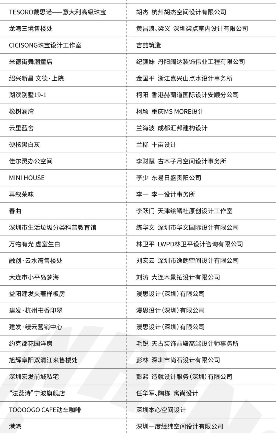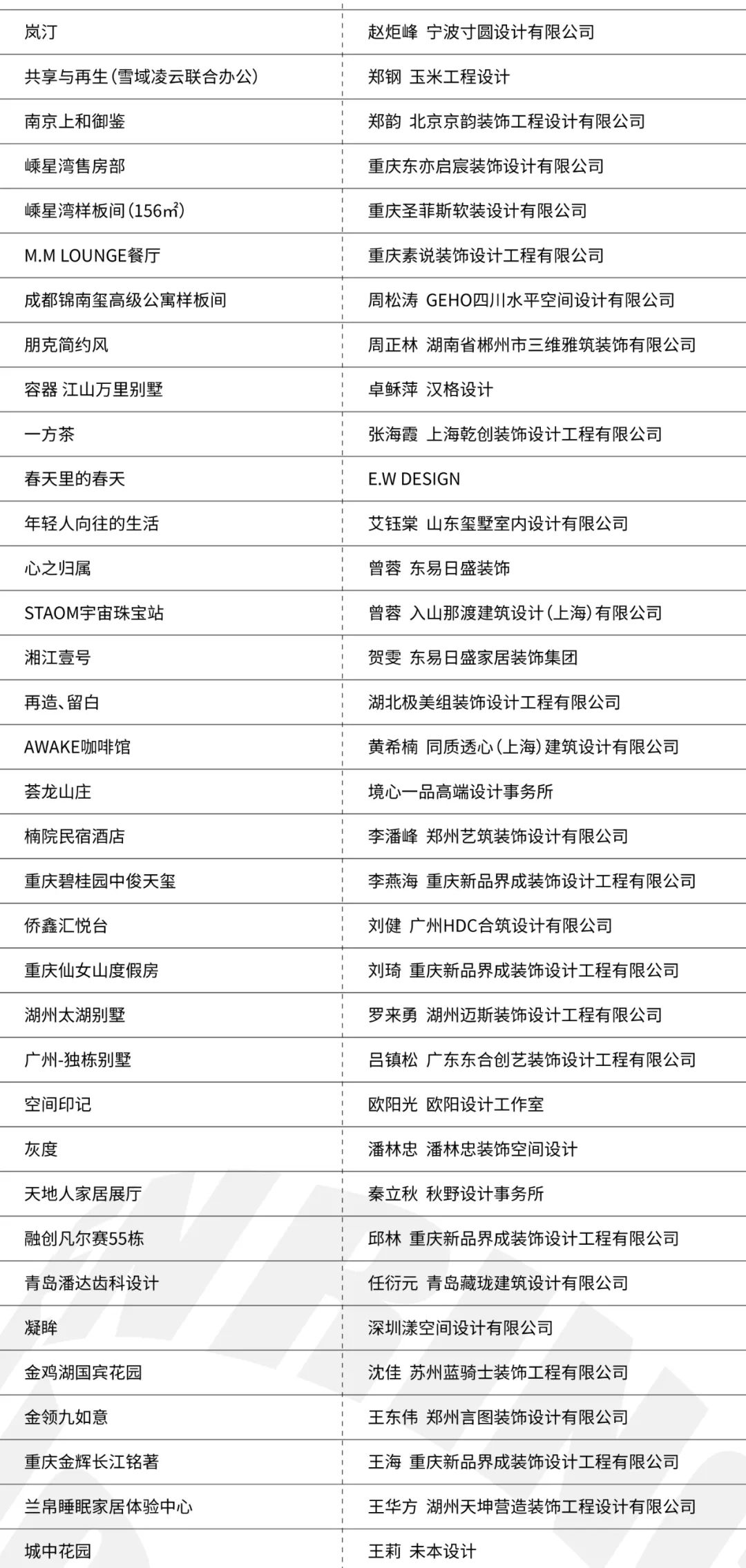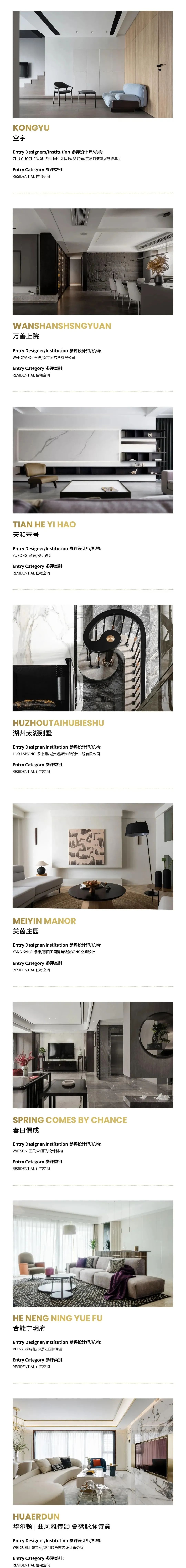 评审委员会根据理念、美学、创新、技巧共四个评审标准从所有参评作品中评选出荣获“2021GRP中意国际设计金指奖·优胜奖”的获奖作品。该奖项自4月21日开启线上参评通道,截至9月15日所有参评作品收集完毕。经由近两个月的评审和筛选,今日“2021GRP中意国际设计金指奖·优胜奖”获奖名单正式公布!本次“2021GRP中意国际设计金指奖·优胜奖”获奖名单由来自售楼空间、会所空间、样板空间、住宅空间、零售空间、办公空间、餐饮空间、酒店空间、展览空间和公共空间共10个空间类别的204套作品组成。(*以下参评设计师/机构排序不分先后)