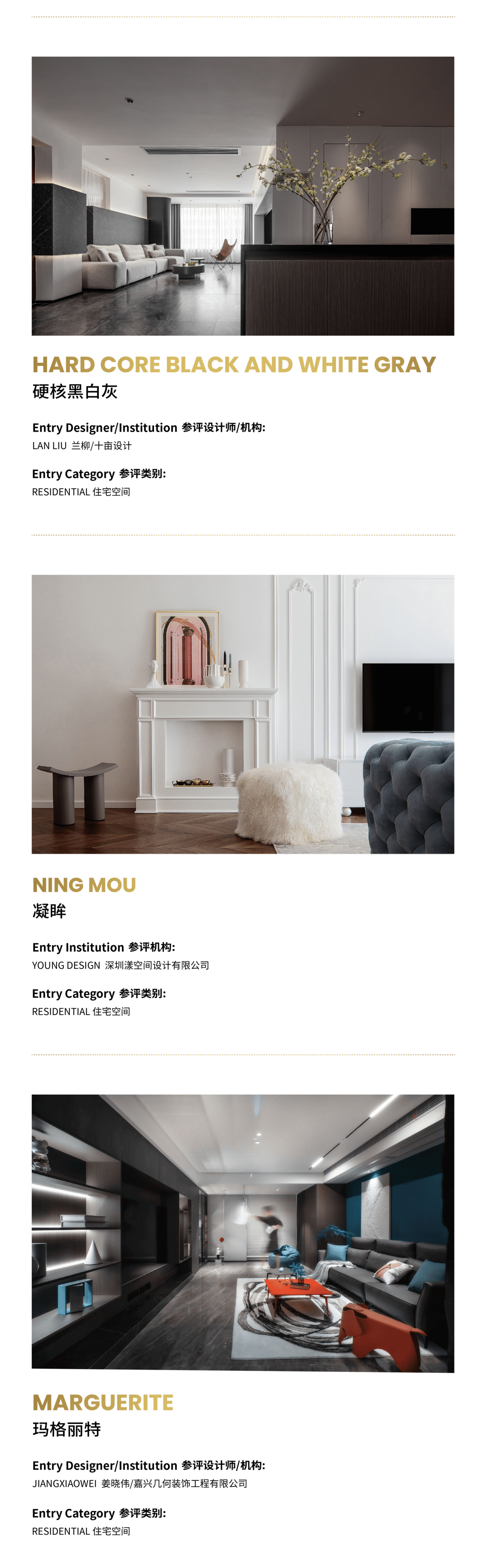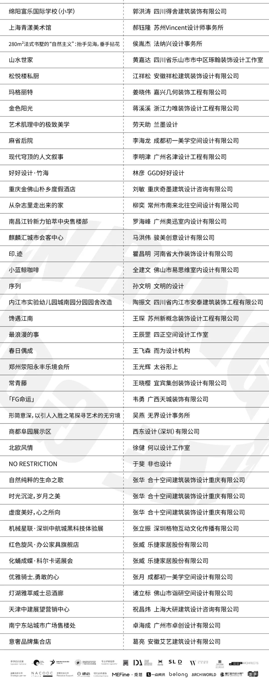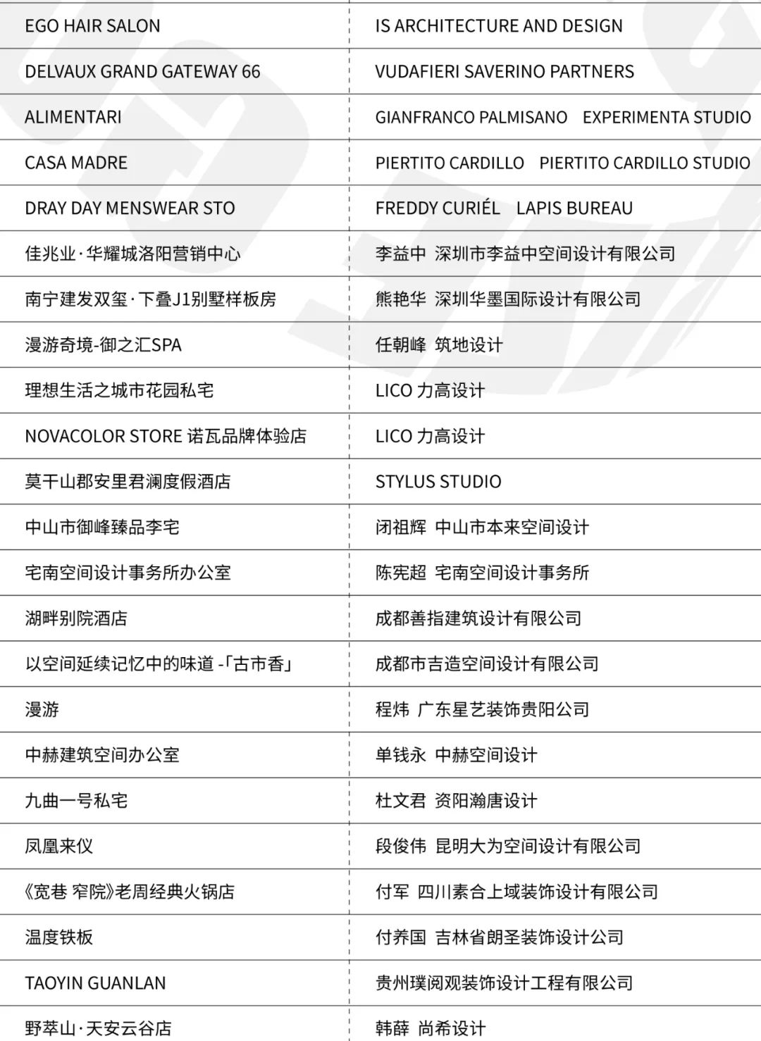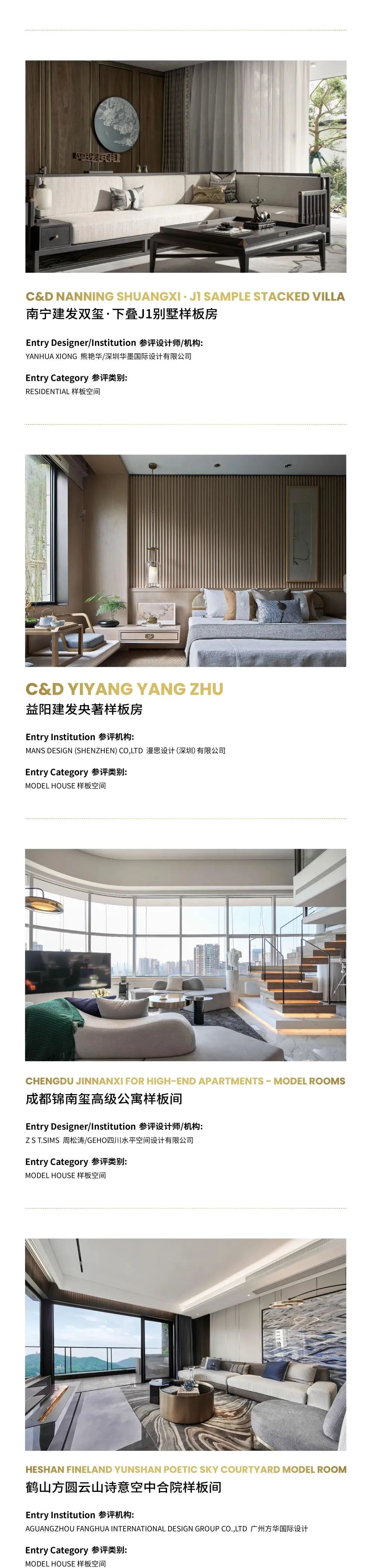 评审委员会根据理念、美学、创新、技巧共四个评审标准从所有参评作品中评选出荣获“2021GRP中意国际设计金指奖·优胜奖”的获奖作品。该奖项自4月21日开启线上参评通道,截至9月15日所有参评作品收集完毕。经由近两个月的评审和筛选,今日“2021GRP中意国际设计金指奖·优胜奖”获奖名单正式公布!本次“2021GRP中意国际设计金指奖·优胜奖”获奖名单由来自售楼空间、会所空间、样板空间、住宅空间、零售空间、办公空间、餐饮空间、酒店空间、展览空间和公共空间共10个空间类别的204套作品组成。(*以下参评设计师/机构排序不分先后)