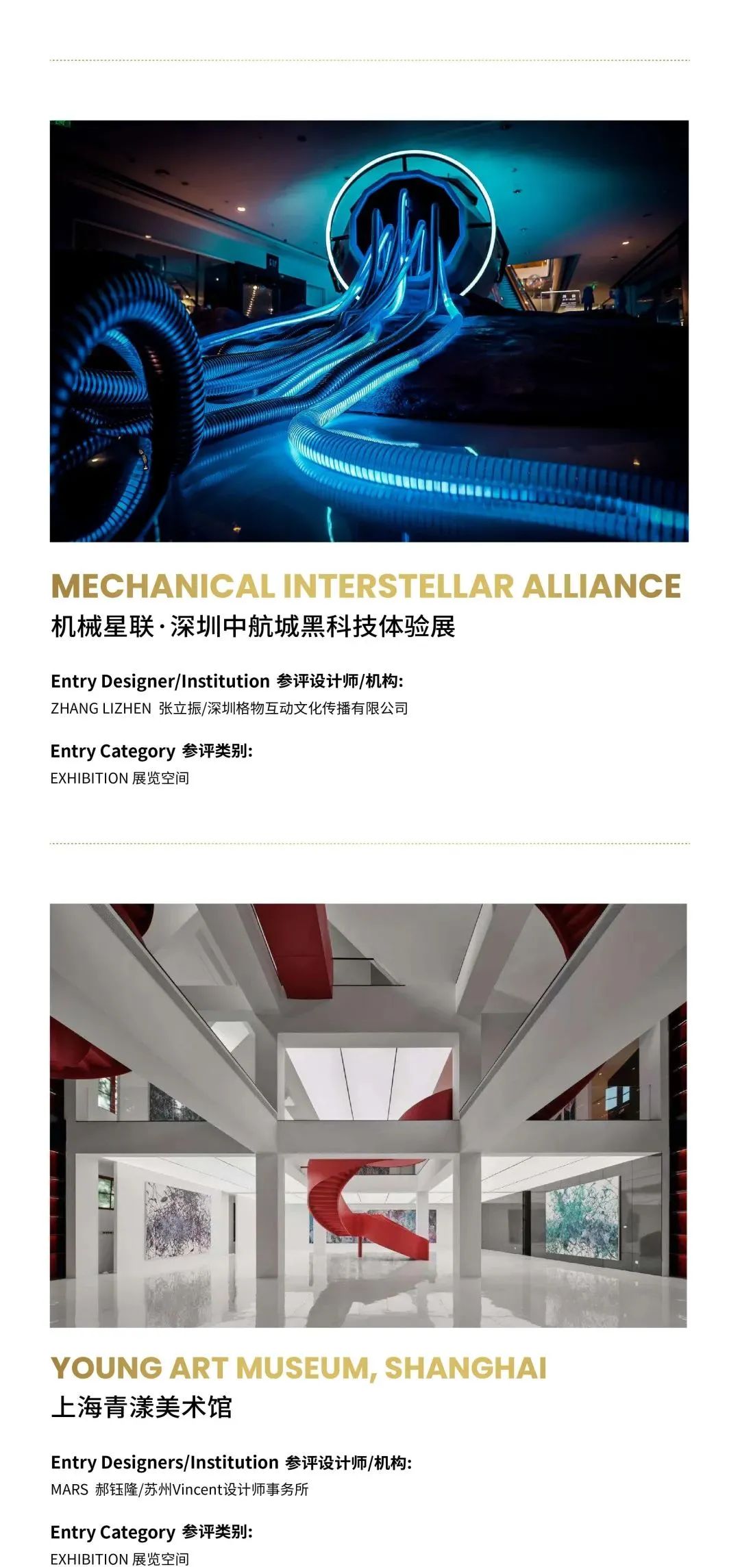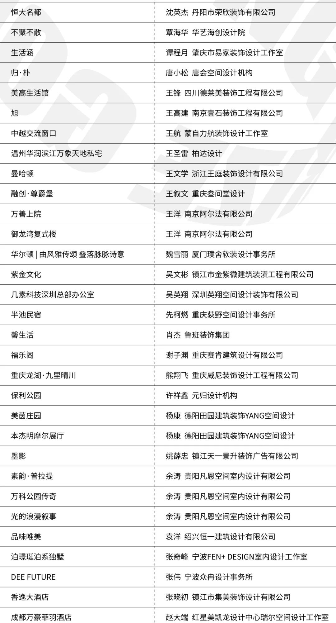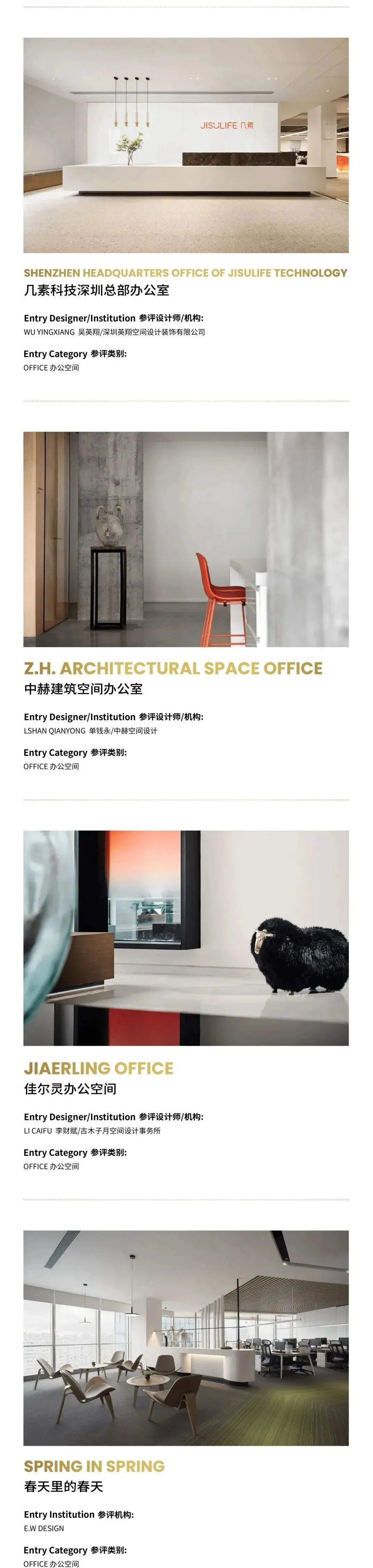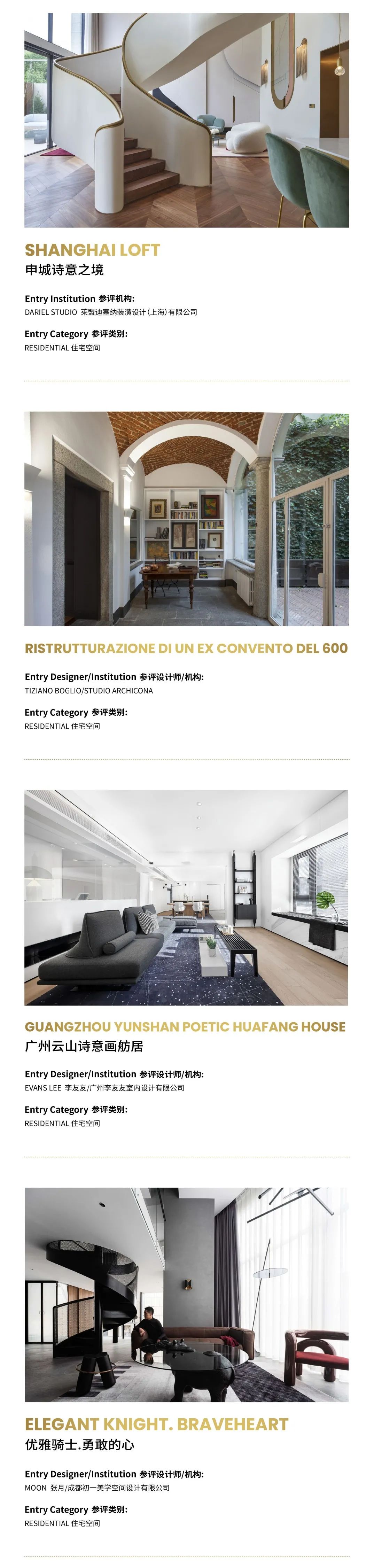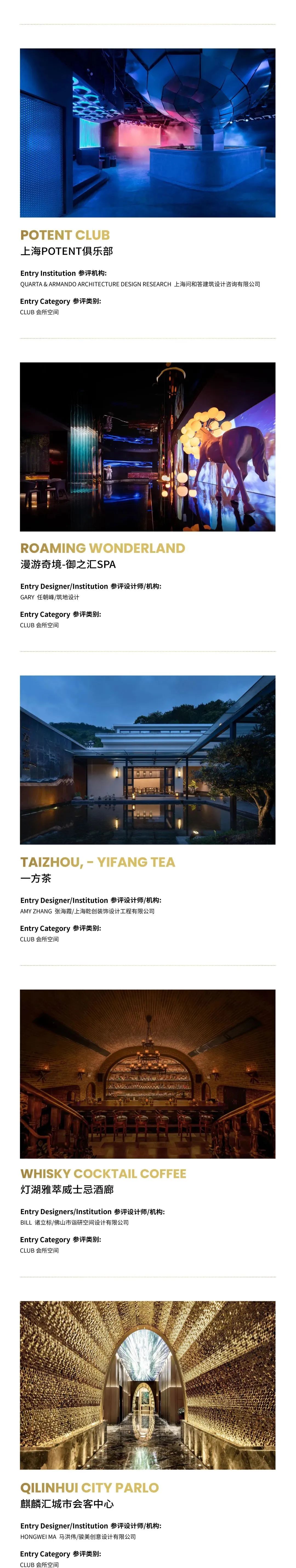 评审委员会根据理念、美学、创新、技巧共四个评审标准从所有参评作品中评选出荣获“2021GRP中意国际设计金指奖·优胜奖”的获奖作品。该奖项自4月21日开启线上参评通道,截至9月15日所有参评作品收集完毕。经由近两个月的评审和筛选,今日“2021GRP中意国际设计金指奖·优胜奖”获奖名单正式公布!本次“2021GRP中意国际设计金指奖·优胜奖”获奖名单由来自售楼空间、会所空间、样板空间、住宅空间、零售空间、办公空间、餐饮空间、酒店空间、展览空间和公共空间共10个空间类别的204套作品组成。(*以下参评设计师/机构排序不分先后)