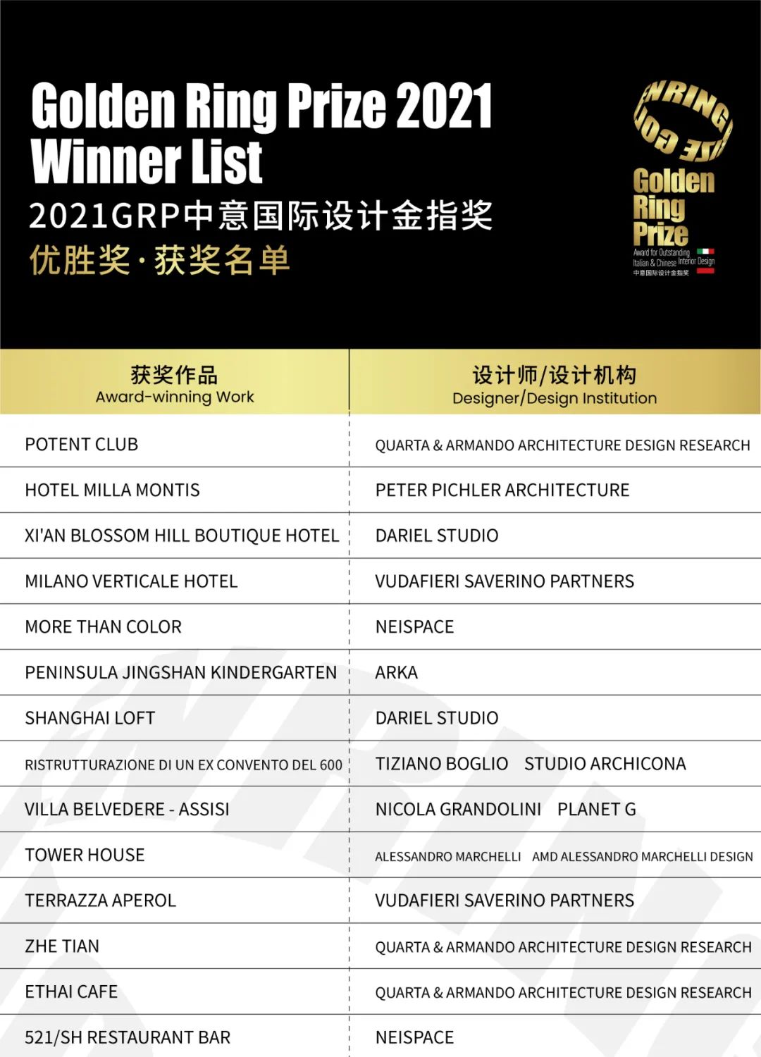 “2021GRP中意国际设计金指奖·优胜奖”的获奖名单由评审委员会从所有的参评作品中选出,参评对象面向2020年至2021年8月31日期间有完成竣工的空间设计项目的中国籍和意大利籍设计师或设计机构,每个参评设计师/机构最多只能参评3套作品。