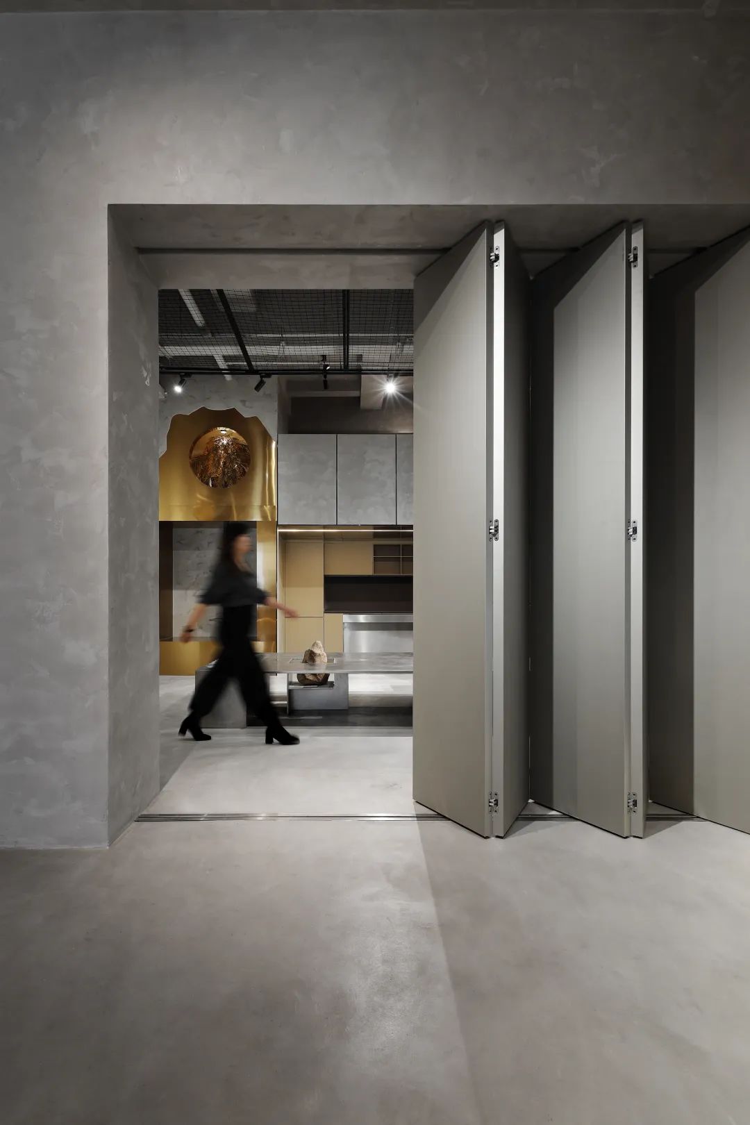 Q. 新作空间内“前店”与“后展”的各个区域关联互动的设计灵感以及策略是什么?您想打造什么样的商业空间?A. 我接受委托设计的时候,具体项目的细节还没有定下来,对整体空间的打造和功能要求也很模糊,使用者方面的想法是想打造一个多功能体验场所。针对品牌形象店,但是要打破原有传统思维,使用方和我不断的探讨了不下10次,最终有了“前店”“后展”的概念。“前店”最终我们决定,售卖区域不用大,让空间承载其他的功能很有必要,所以我们售卖与储存的前店只用了250㎡里空间的60㎡。“后展”设计定位为集商业、展览、活动、休闲为一体的多功能文化空间,在开放式空间设计中,空间与空间之间的穿插既保持互通相连,又体现出每个空间的独立性。