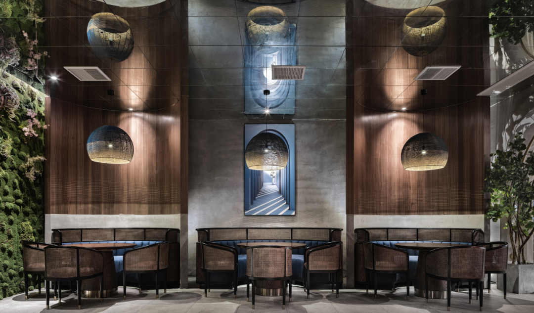 清新明快的现代设计与环保可持续精神相融合,让空间、光影、自然、可持续完美结合,大量的绿植配合朴拙的混凝土给予顾客最纯粹的用餐氛围。