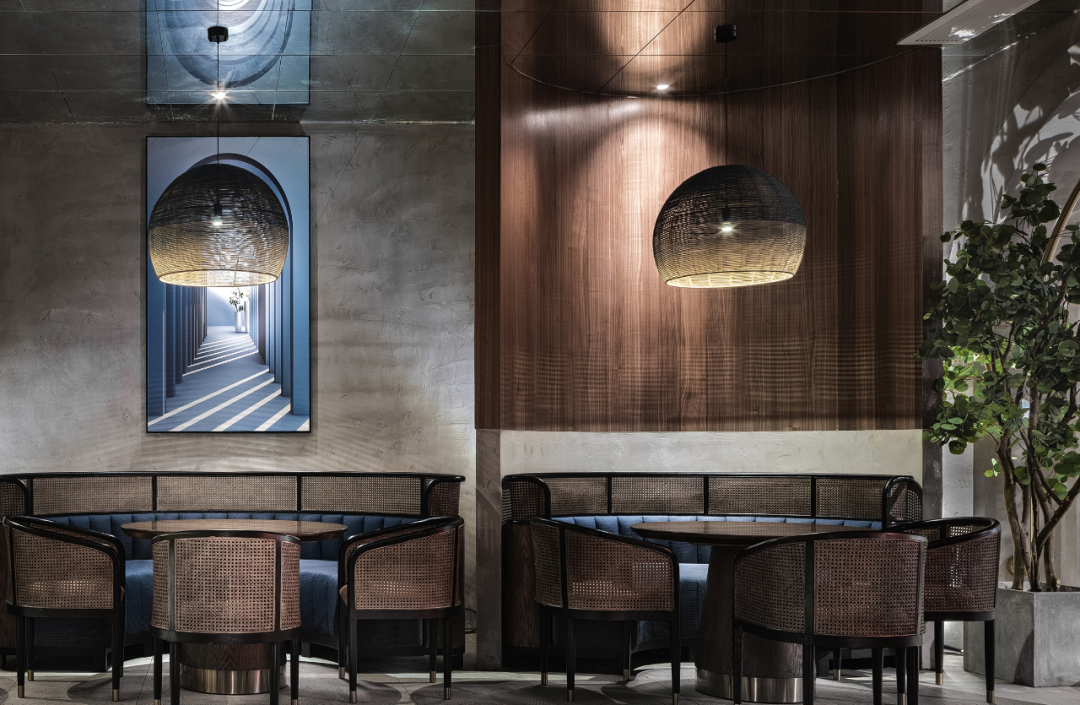 天面的竹编装饰具是曲线的延伸,拉伸了视觉感官,环绕着室内以形意柔化空间,契合用餐空间的氛围。混凝土是最妥帖的底色,空间在混凝土的大面积的包裹下,尽显淳朴。木质墙面的运用以及家具的搭配增加了空间的温度,也显得层次丰富。
